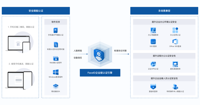 旷视FaceID企业版解决方案,是以“人”为核心的人工智能企业空间身份管理方案。 基于AI赋能的生物特征识别技术,打造新一代多因素身份认证平台,实现企业空间内“人员-设备-系统-应用”高效连接,为客户提供更安全、更智能、更高效的办公和生产体验。